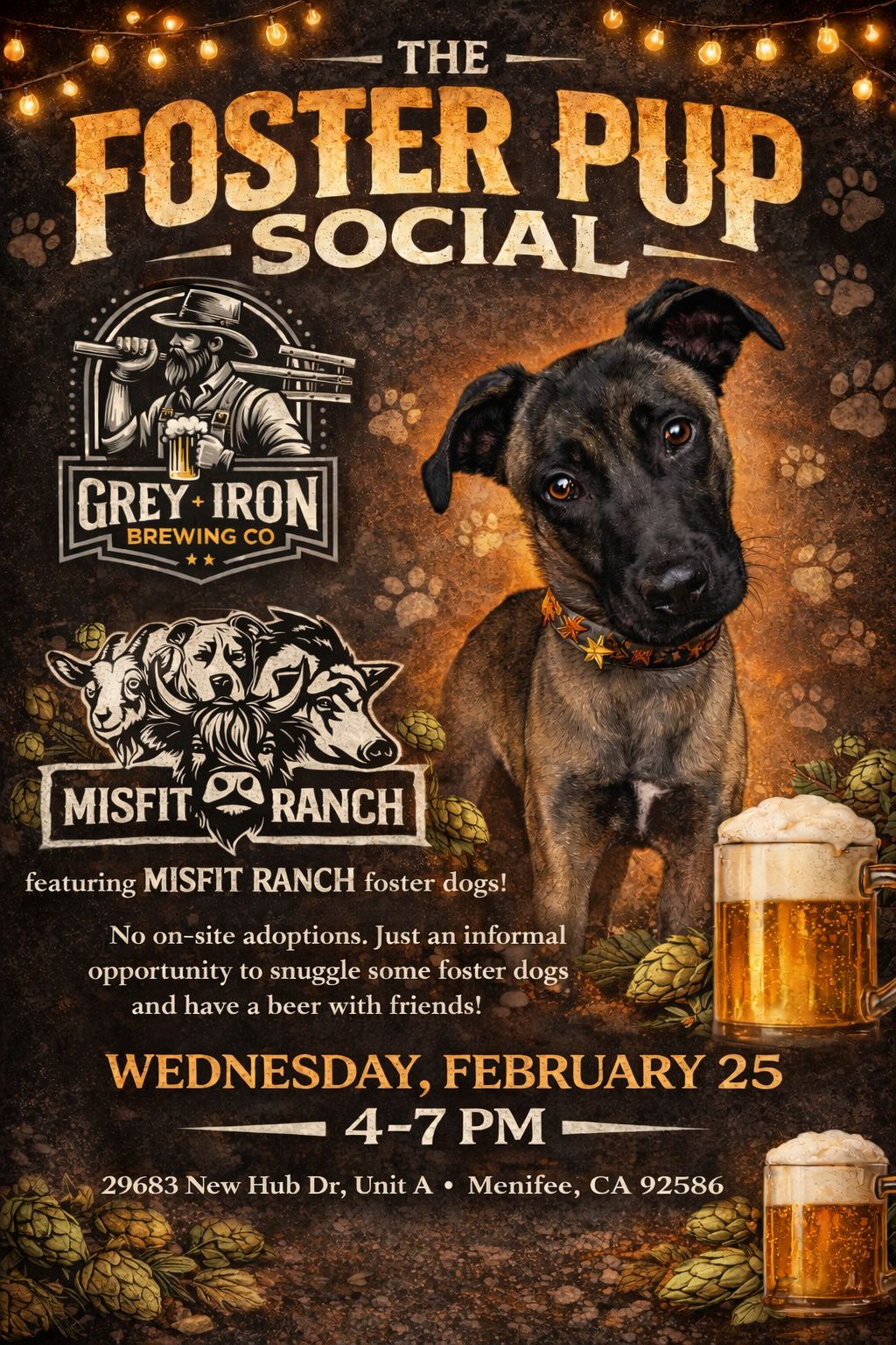 Join us for THE FOSTER PUP SOCIAL at Grey Iron Brewing Co in Menifee. No on-site adoptions. Just an informal opportunity to snuggle some foster dogs and have a beer with friends!
